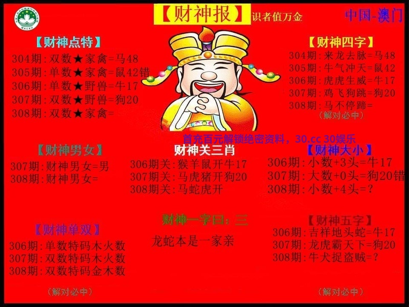 | 306期 | 马 | 3尾 | 2头 | 开牛17 |